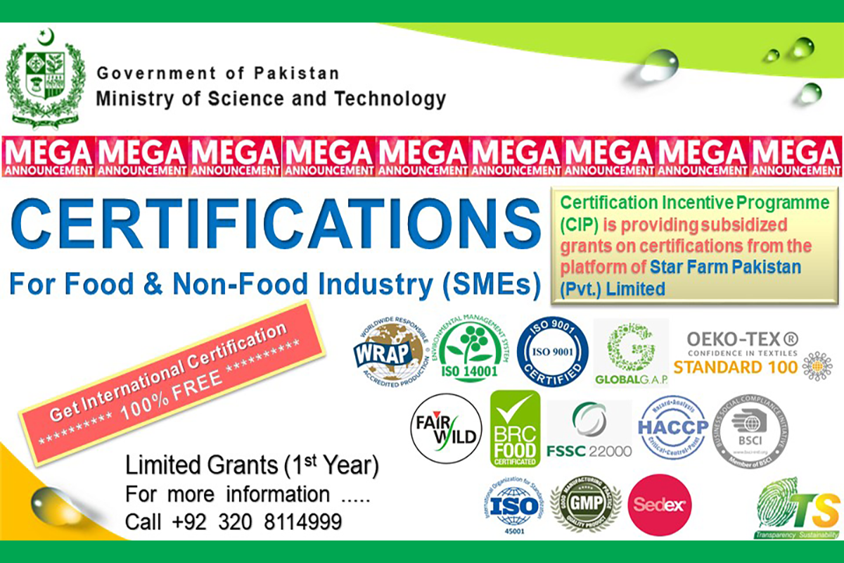 Star Farm Pakistan (Pvt) Limited is executing a project entitled “Certification Incentive Programme” in collaboration with Ministry of Science and Technology to uplift the portfolio of Small and Medium Enterprises (SMEs) in Pakistan.